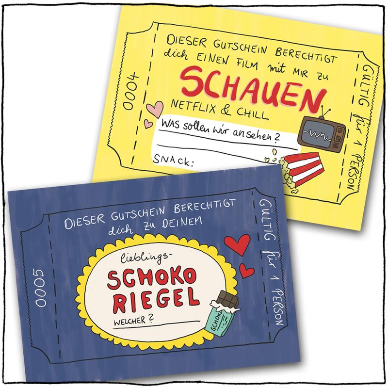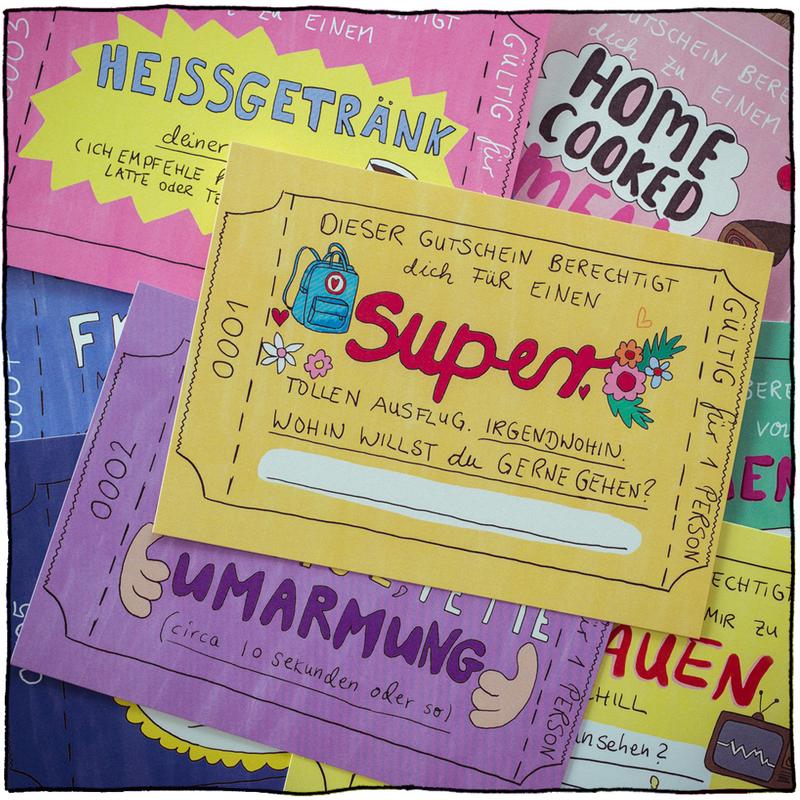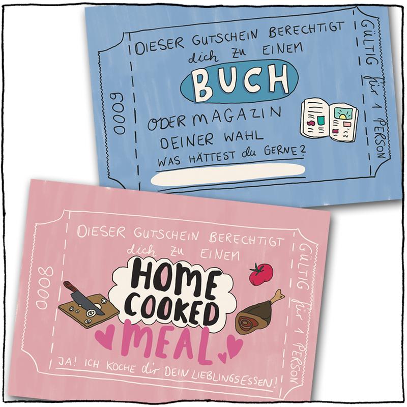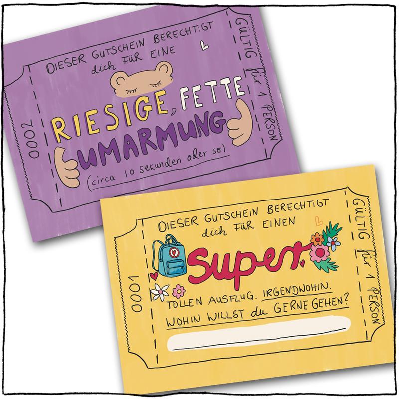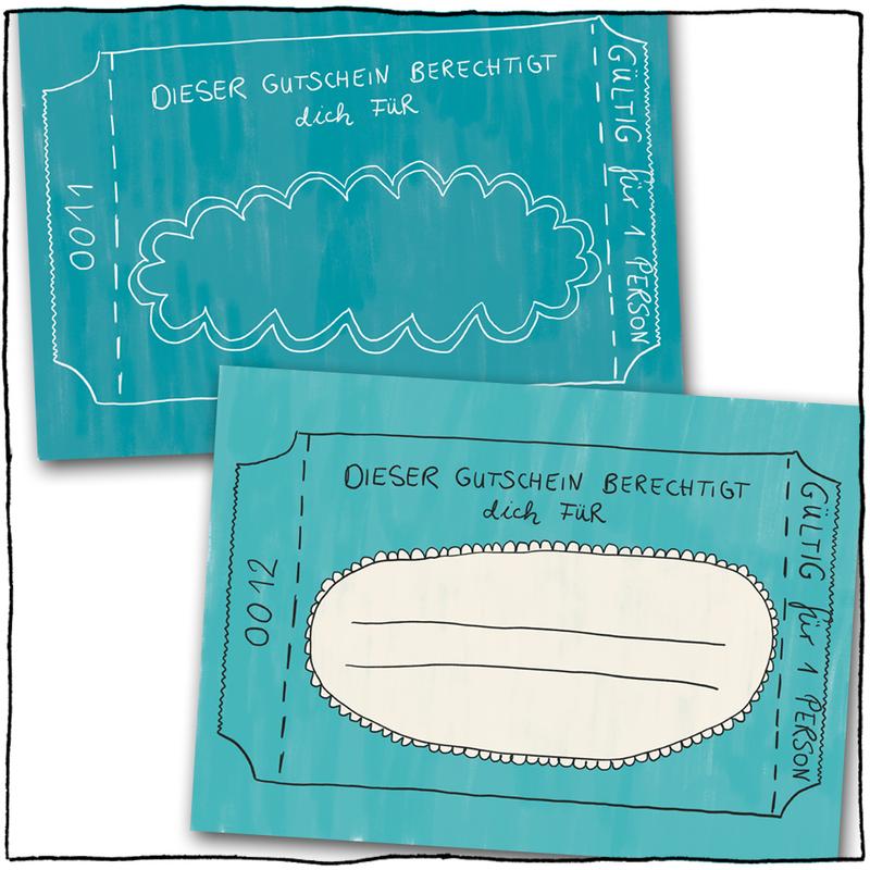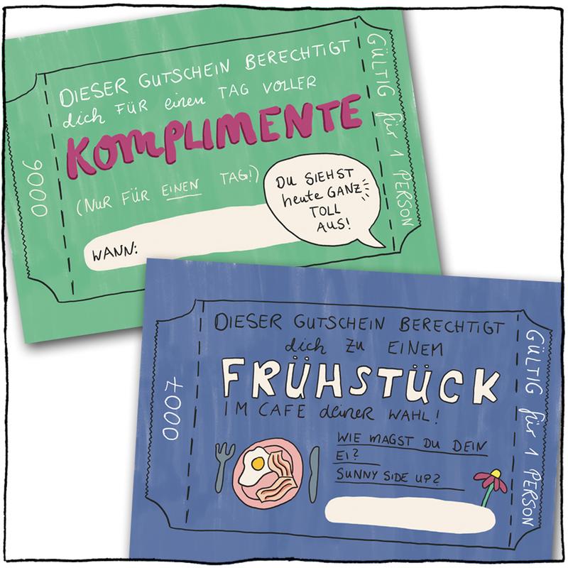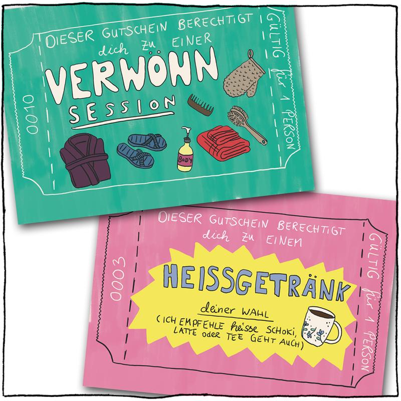 Bist Du auf der Suche nach einem besonderen Geschenk? Es muss natürlich echt super-schön sein und darf auch gerne so einen „handmade touch“ haben! Nix von der Stange halt! Ich hab dafür 12 verschiedene Gutschein-Postkarten mit unterschiedlichsten Geschenken gemalt. Von der kostenlosen Umarmung bis zum aufwändigeren Frühstück ist alles dabei, und wenn was fehlt: Zwei Karten kannst Du selbst ausfüllen. Das 12 Kartenset plus 1 Deckblatt ist einseitig bedruckt, d.h. hinten hat es noch Platz für irgendwelche extra Nachrichten drauf. Die 13 Karten stecken in einem minzegrünem Umschlag mit Sichtfenster. Und weil ich das noch zu nackt fand, habe ich noch schnell einen extra Sticker gemalt und vorne drauf geklebt. Findest Du die Box genauso schön wie ich?