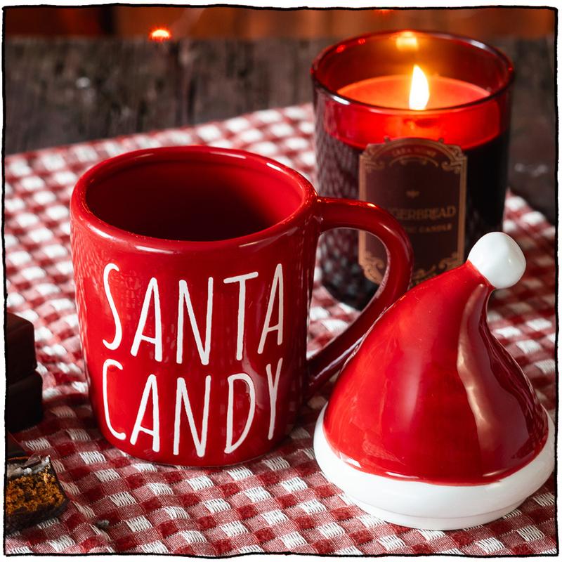 Rote Tasse mit weißem Santa Candy Druck & rot-weißer Mütze. Aus Keramik gefertigt.